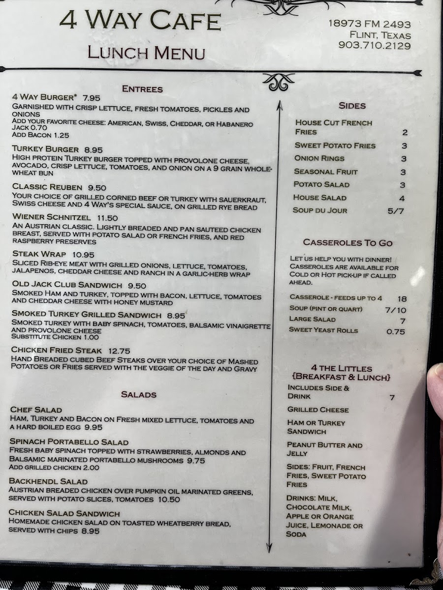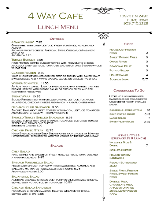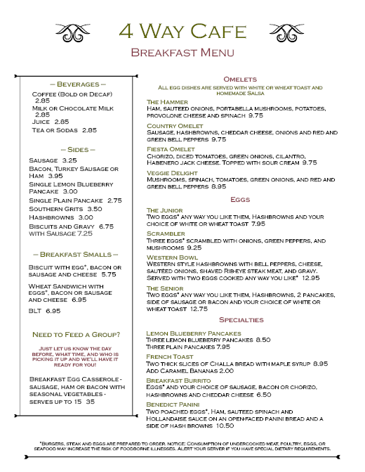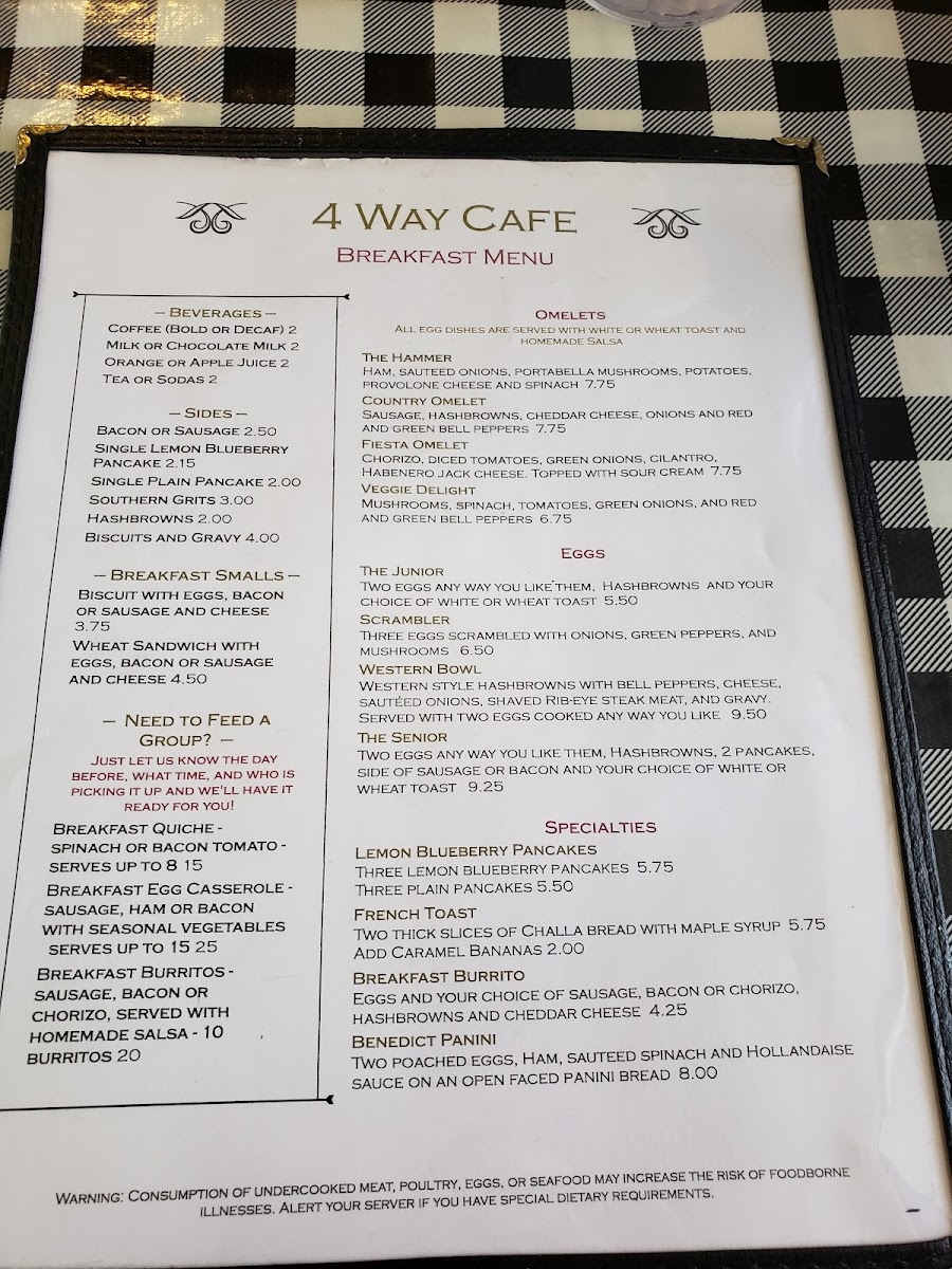 4 Way Cafe offers a straightforward, comforting menu ideal for breakfast and casual daytime dining. Here, you’ll find classic café favorites alongside hearty, home-style dishes that invite a relaxed pace and easy conversation.